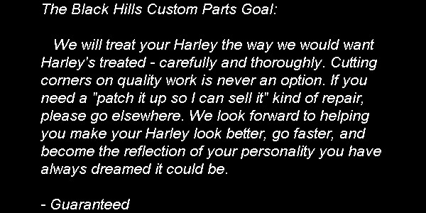 | Black Hills Custom Parts knows how important bike maintenance is. Servicing your Harley-Davidson at Black Hills every 2500 miles will keep your bike running it's best! The service mechanic's here will perform a thorough service on your Harley-Davidson every 2500 miles, which includes: |
